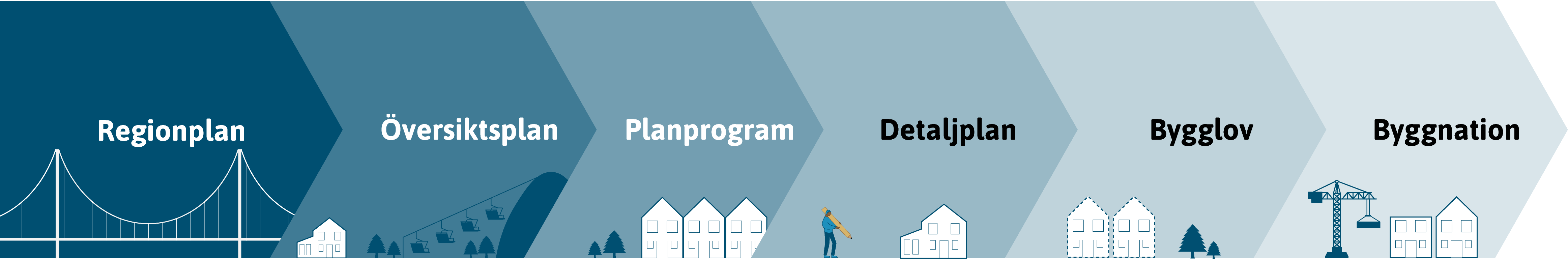 Illustration: Samhällsbyggnadsprocessen, där delarna i följd är regionplan, översiktsplan, planprogram, detaljplan, bygglov och byggnation